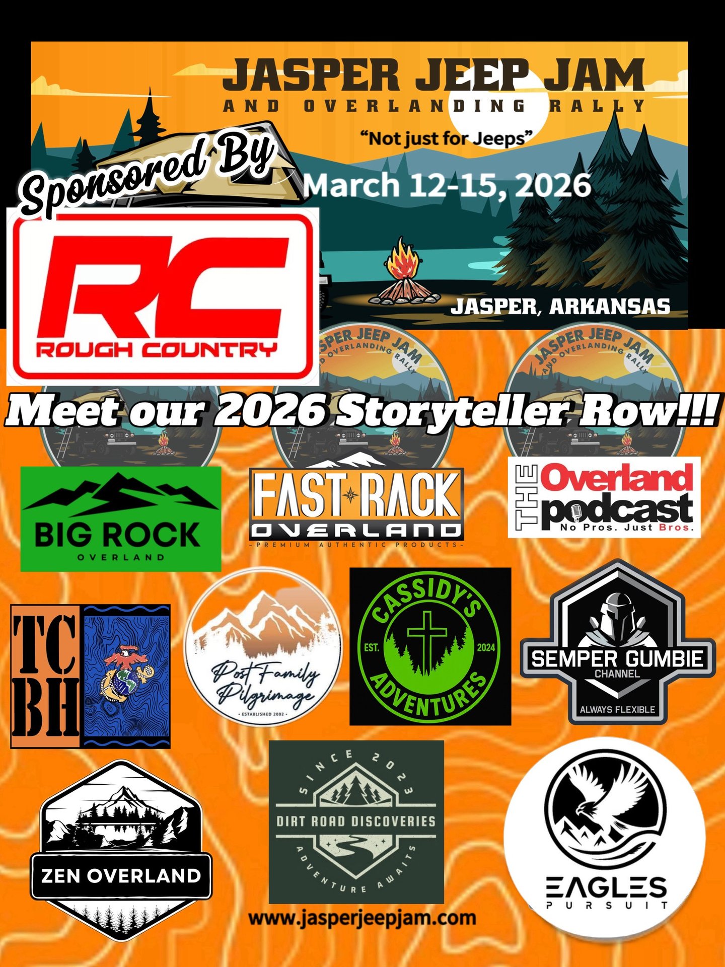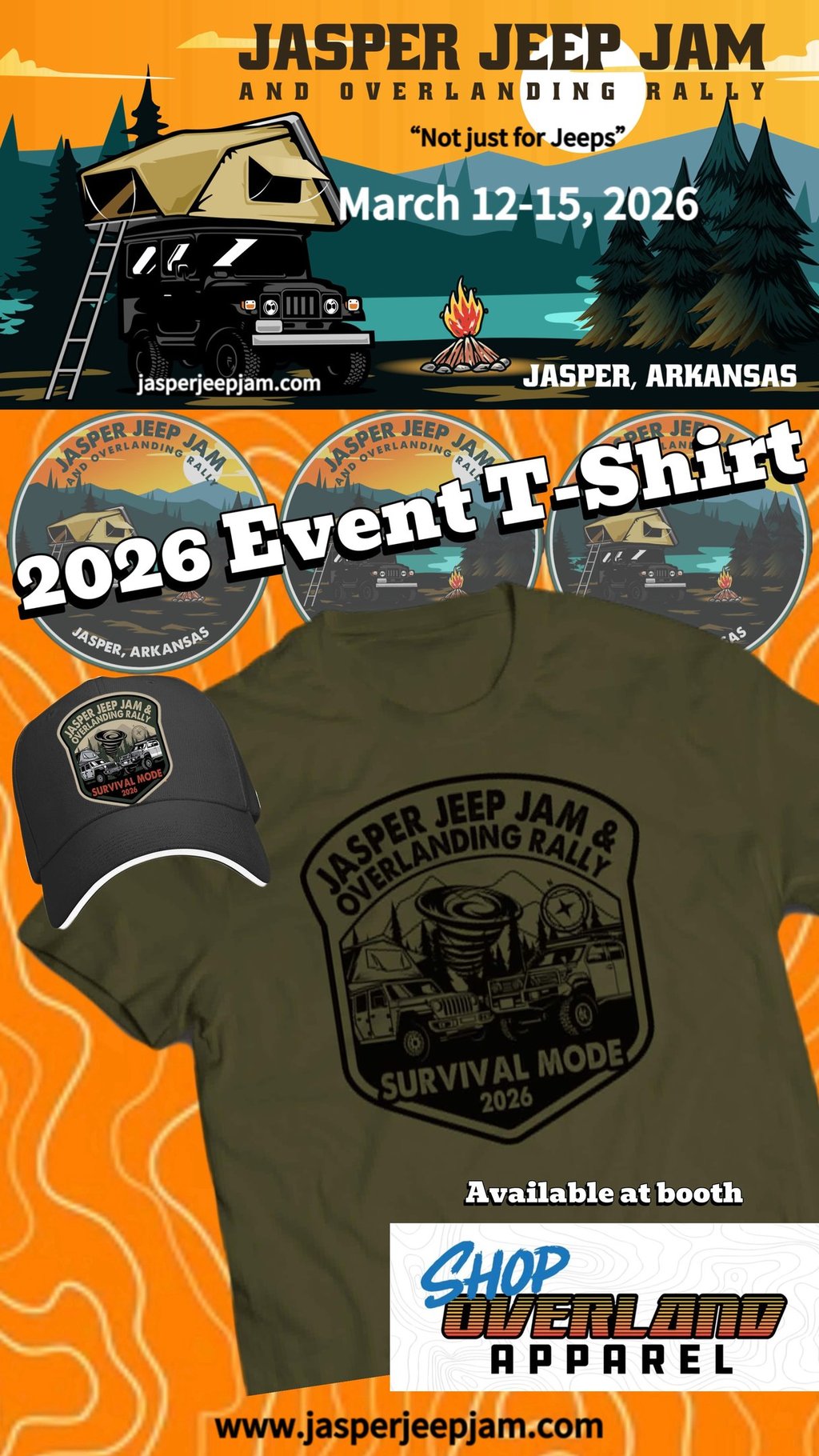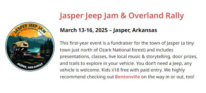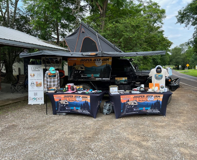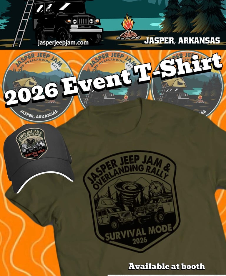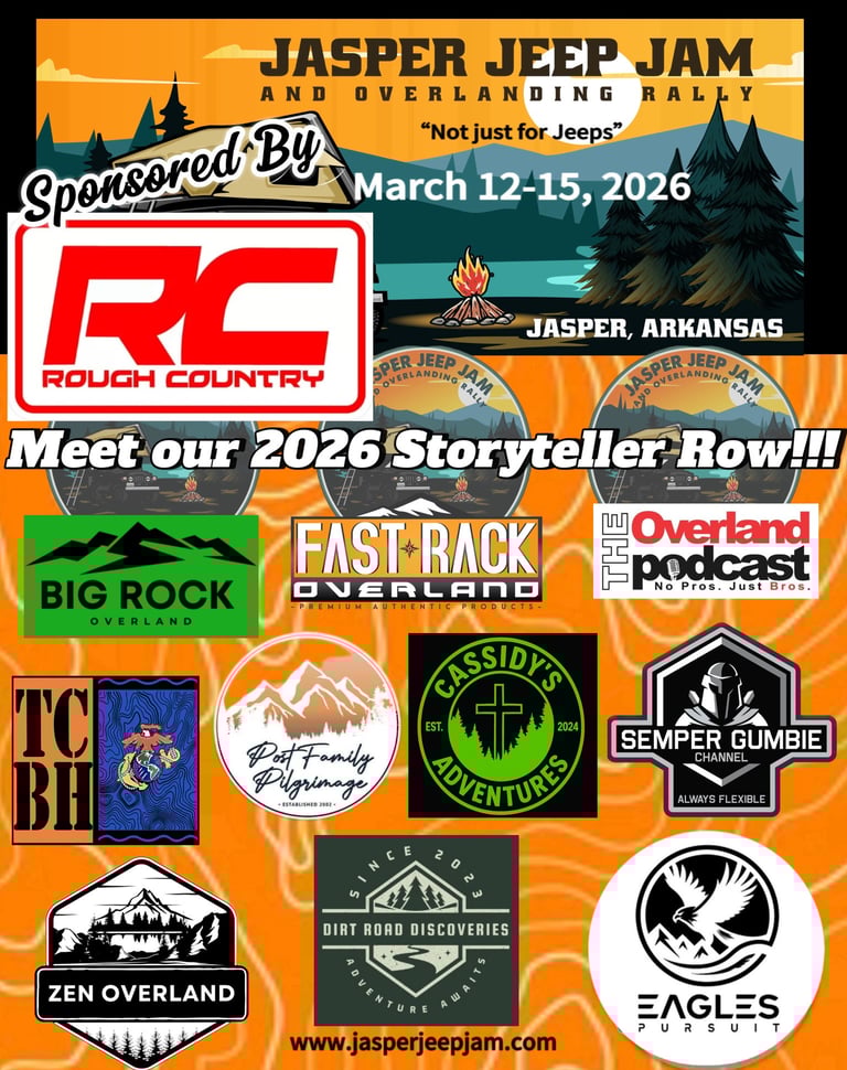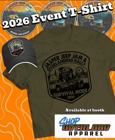 Welcome back to our 3rd annual Jasper Jeep Jam and Overlanding Rally. Come spend the weekend with us in the breathtaking landscape of the Ozark Mountains. The picturesque city of Jasper, Arkansas is wonderfully situated between the Ozark National Forest and The Buffalo National River. Connect with fellow overlanders/YouTubers/podcasters, shop merchandise vendors, enjoy food vendors, sit in on educational classes, pull up a chair every night at our main stage for some great entertainment, and explore the great outdoors. Each day is filled with fun and entertainment. Scroll down to find our schedule of events. This event is named "Jasper Jeep Jam and Overlanding Rally", but we absolutely welcome all vehicle makes and types.