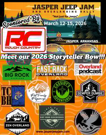 Welcome back to our 3rd annual Jasper Jeep Jam and Overlanding Rally. Come spend the weekend with us in the breathtaking landscape of the Ozark Mountains. The picturesque city of Jasper, Arkansas is wonderfully situated between the Ozark National Forest and The Buffalo National River. Connect with fellow overlanders/YouTubers/podcasters, shop merchandise vendors, enjoy food vendors, sit in on educational classes, pull up a chair every night at our main stage for some great entertainment, and explore the great outdoors. Each day is filled with fun and entertainment. Scroll down to find our schedule of events. This event is named "Jasper Jeep Jam and Overlanding Rally", but we absolutely welcome all vehicle makes and types.